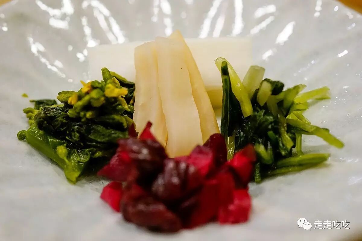 随后一小杯莼菜(蓴菜),酸汁嫩芽,配上少许新鲜山葵,正适合渐渐热起来的初夏时节。莼菜乃是江南风物,浙江人十分熟悉。但某些菜馆不严格按照时令,至过了季节,还提供莼菜鱼圆汤,此时莼菜大多叶子已张,好似小荷叶般荡漾在清汤中,粘液少了,口感有种磨砂质感。有几次在香港的杭州酒家便有这样的体验。而日本料理中多选用嫩芽,粘液包裹着嫩芽,爽口至极,配上简单的酸汁和山葵,真是开胃良菜。两相对比,显然后者更可取。