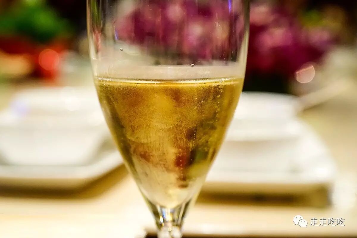 这一年的库克昂博奈年份酒饱满纯净,味道浓郁,有坚果的香气和丰润感,入口便让人十分喜欢。我先拿到酒便先尝了下,而服务员还在分菜台倒雪碧般分着香槟。这时悲剧发生了,服务员用托盘派酒,一不小心托盘倾斜,她为了扶正在倾倒的一杯酒时,整个托盘上的酒如多米诺骨牌般,逐一砸翻在地。这一款酒本身应该在气泡消散后进行第二步品尝,现在可好,都给地板喝了。