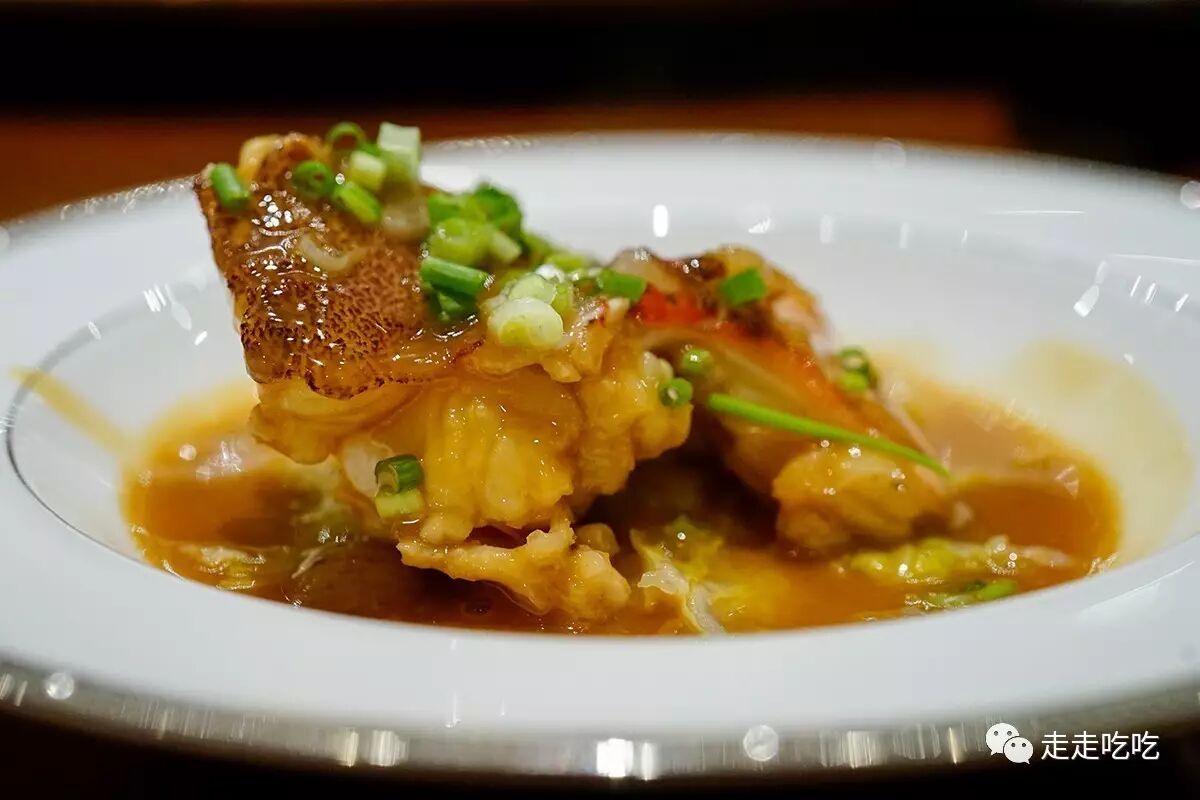 台式家烧东星斑是典型的过犹不及的菜式,吃得出东星斑是新鲜的,但用这豆酱红烧了,鱼肉的细腻鲜甜全被掩盖,最后撒的细葱更是喧宾夺主。既然是整条的东星斑,如果品质突出,为何不做广式蒸鱼。很多时候,清蒸鱼是检验一家粤菜馆的不二法门。