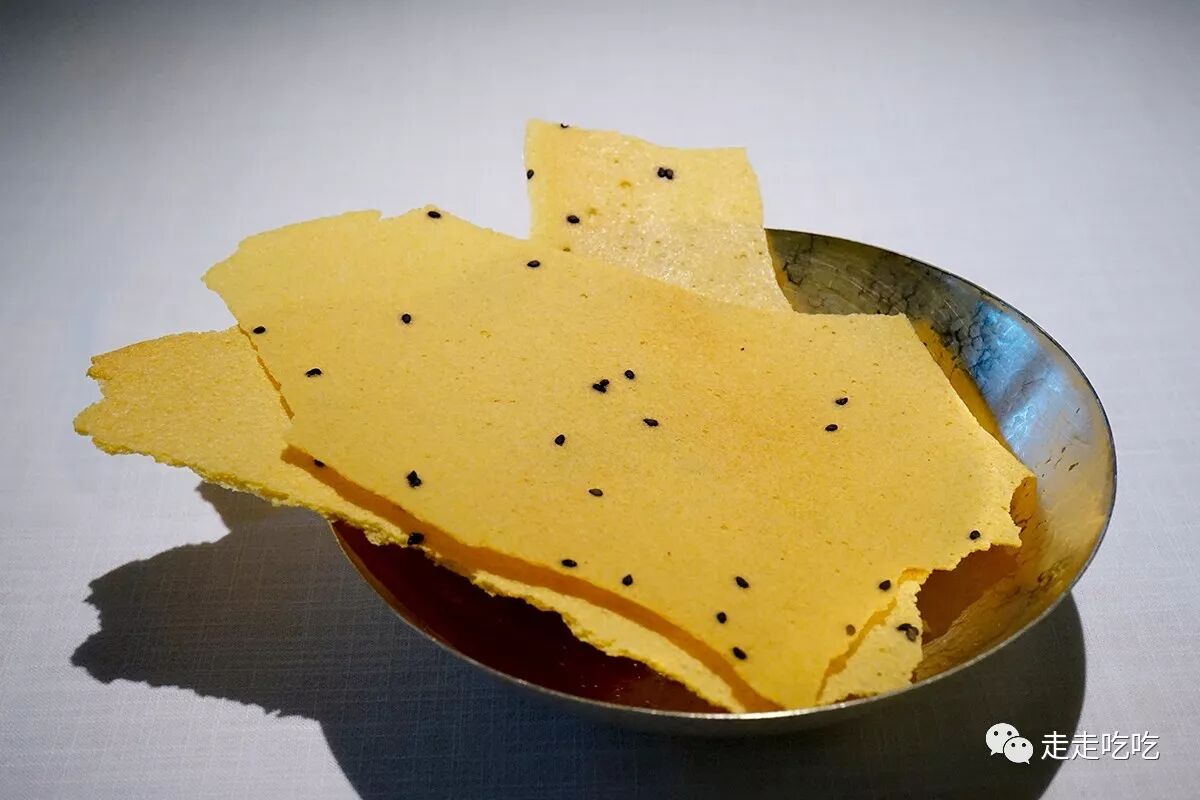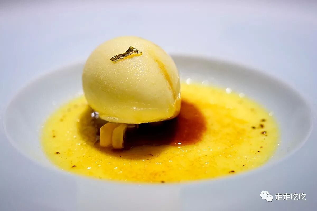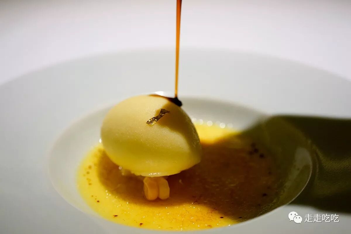 酒足饭饱,菜单亦接近尾声。玉米饼点用的是西式的做法,玉米冰淇淋配上炖蛋,加一片金箔,就好像很宫廷了似的,但实际上无聊透顶。