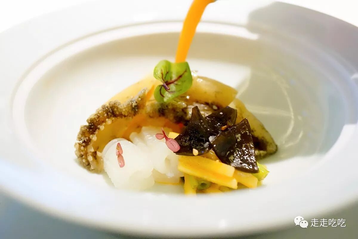 接下去的鲍鱼豆酱水拌鱼片就体现了酱在朝鲜宫廷料理中的重要性。软嫩的鲍鱼配以脆口的鱿鱼片,佐以木耳等菌蔬,加上由大豆酱、辣椒膏和醋稀释而成的豆酱水,是一道非常开胃的菜式,也是整个晚餐中我最喜欢的菜之一。这豆酱水滋味丰富,酸甜咸辣兼具,正好为味道较淡的鲍鱼和鱿鱼添味。不过菜品上桌后再倒汁水的做法,显然不是李朝的仪制吧?