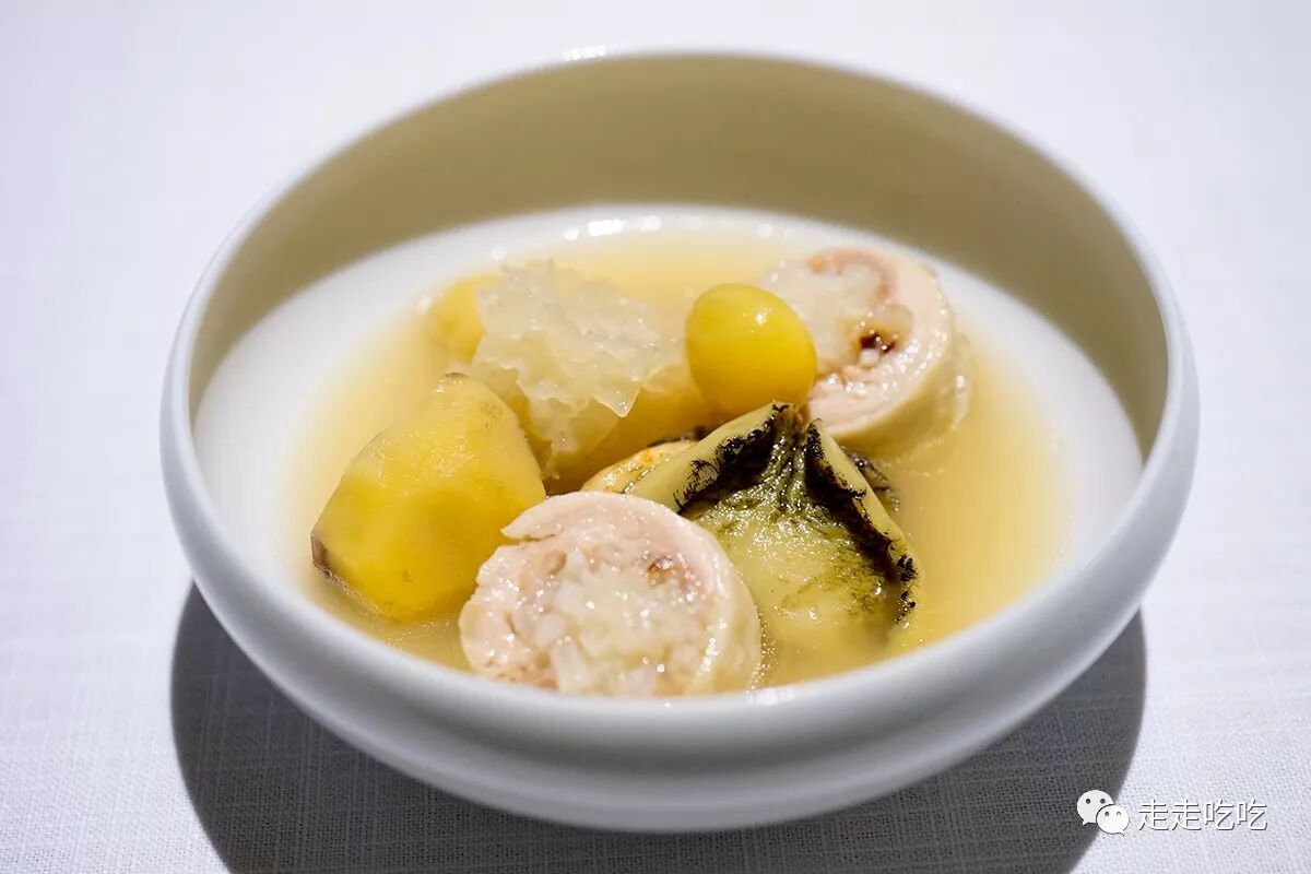 平心而论,罗宴的参鸡汤是鲜美的,虽无韩国街头砂锅参鸡汤那种沸腾的刺激感,但味道淡雅有序、用料到位、做工精细。不似民间参鸡汤整鸡登场的架势,罗宴把鸡肉卷着糯米做成小卷,配以糯软的鲍鱼和白果、栗子、银耳等配菜,在鸡汤淡淡的人参味中飘荡着鸡肉的香气。配的小菜亦开胃可口,但无甚可称道处。