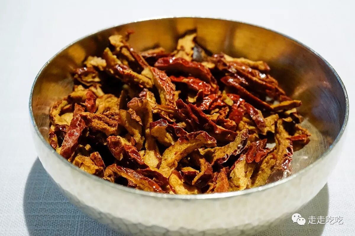 与玉竹茶相配的是两款小点心,一为鸡蛋甜薯芝麻脆饼,一为脆枣,是为菜单上的“开胃小吃”。脆枣味道不错,脆口而不硬,甜而不齁;脆饼十分松脆,内部空隙密布,入口即散,是不错的零食。但甜食常有闭塞胃口之效果,做开胃小吃不甚合理。而且不知道当年在宫廷里是不是也如此上菜,两个银碗颇有些过年招待亲戚的既视感。