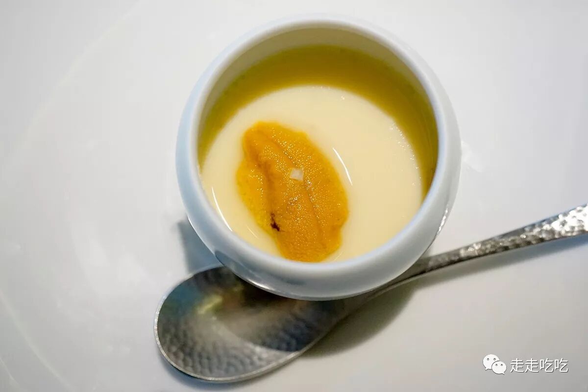 开胃菜之后是迎宾菜,乃海胆蒸蛋,配以海盐。罗宴用的各色物产无需多问,都是朝鲜半岛所产(气泡水不是)。海胆乃朝鲜产,味道较淡;配以温润的蒸蛋,是一段平衡却又少些波澜的开场白。