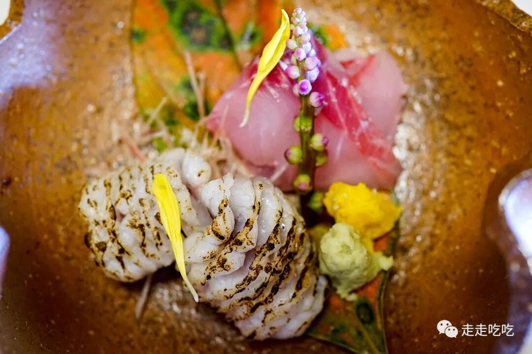 与刺身搭配的是季节性菜蔬花朵,有少许腌渍过的菊花、新鲜蘘荷(茗荷)和落葵(蔓紫)。三种配菜各自的味道都很有个性,与鲤鱼和河鳗刺身相结合完成了一副多彩的秋日图景。