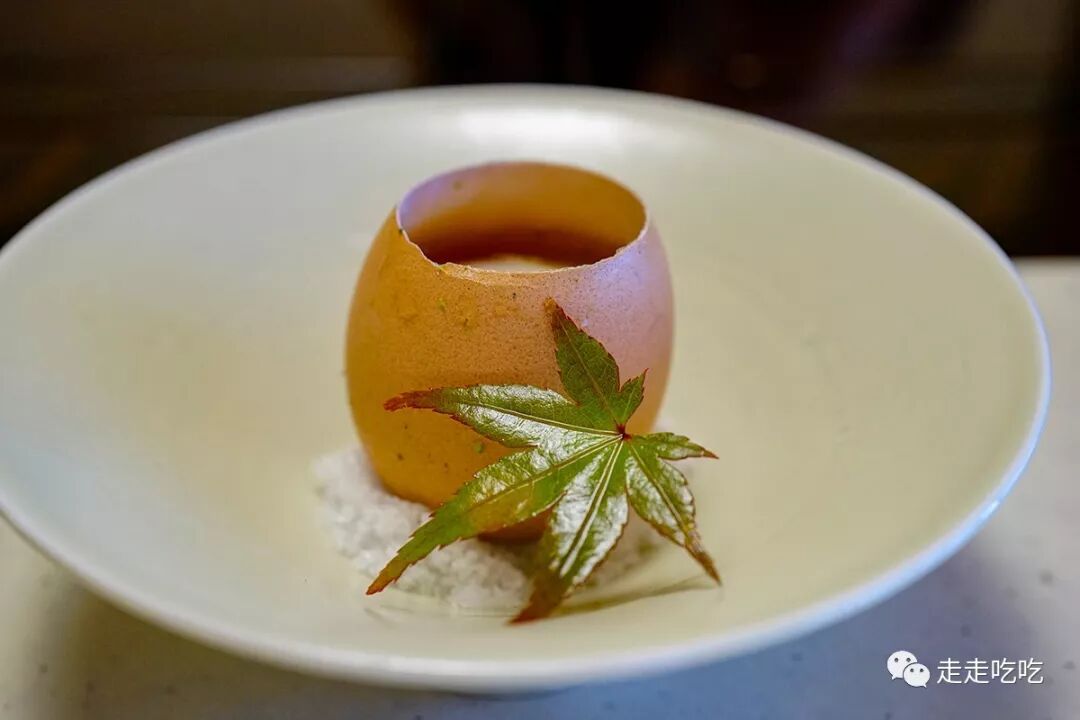 吃完松茸大餐后,炭炉撤去,个室才显得不十分闷热。仲居拿来一个开了口的鸡蛋,乍一看让人想起国内铁板烧店常有的鹅肝鸡蛋伎俩——只看外表是绝对猜不出鸡蛋里面的乾坤的。