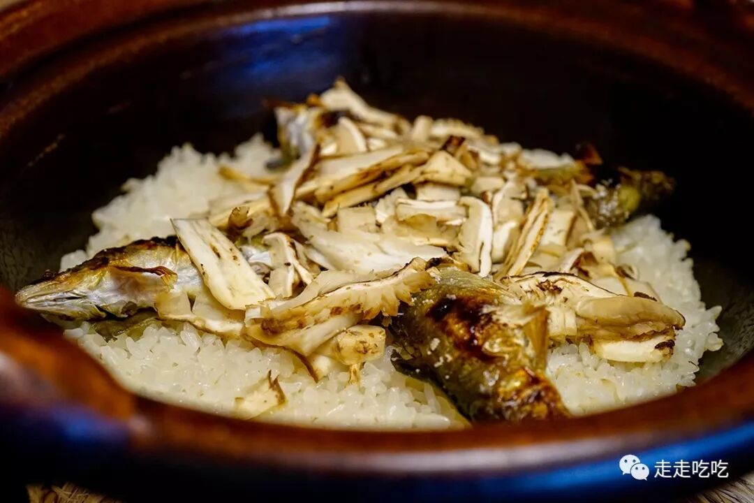 秋日的菜单中,松茸和抱籽香鱼是绝对的主角,御饭里香鱼和松茸同烹,创造出令人印象深刻的秋日主食。抱籽香鱼和松茸固然妙,但给这御饭画龙点睛的却是少许川海苔(カワノリ)和极少量的山椒。川海苔顾名思义生长在淡水河川中,产量稀少,有着淡淡的清香,又与海苔的味道不同,于我而言又是初次体验。山椒清新的味道平衡了抱籽香鱼的肥美和松茸的浓重味道,使食客既可以享受丰盛的主食,又不至于感觉腻烦。