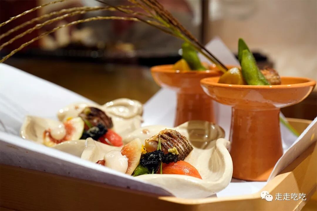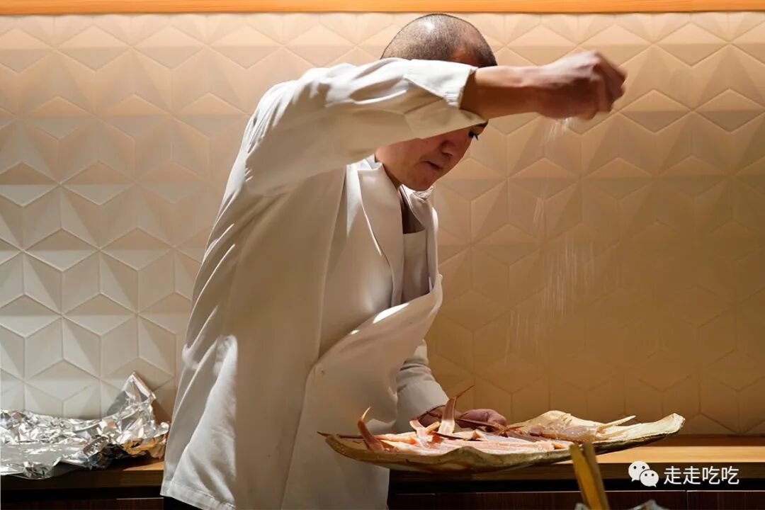 纪茂登的主厨木本师傅虽与松川师出同门,但两者的风格迥异。纪茂登的菜式呈现简洁的美学,但餐厅的氛围是热烈活泼的。这也许与主厨的性格有关,主厨木本安哉在料理时则一丝不苟,但在与客人闲谈时则十分放松,毫不拘束。私下里亦是十分平易近人,我送他一本走走吃吃的画册,他立马跑出去放到了玄关台子上,令我受宠若惊。