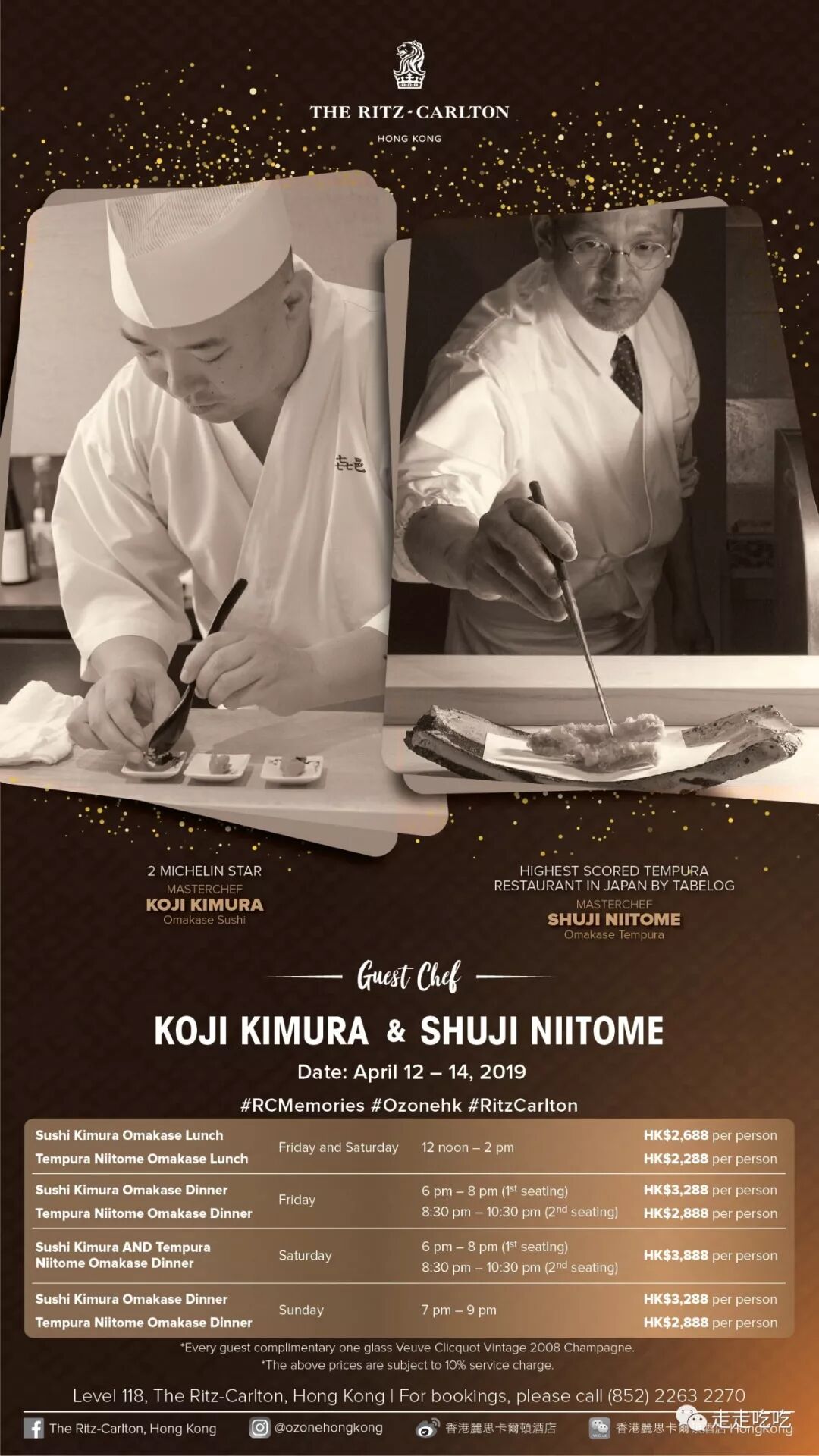 今年4月12-14日(周五至周日),著名的熟成寿司すし喜邑(Sushi Kimura,戳!)主厨木村康司和目前Tabelog天妇罗门类排名第一的にい留(Niitome)主厨新留修司将莅临香港丽思·卡尔顿酒店献艺。