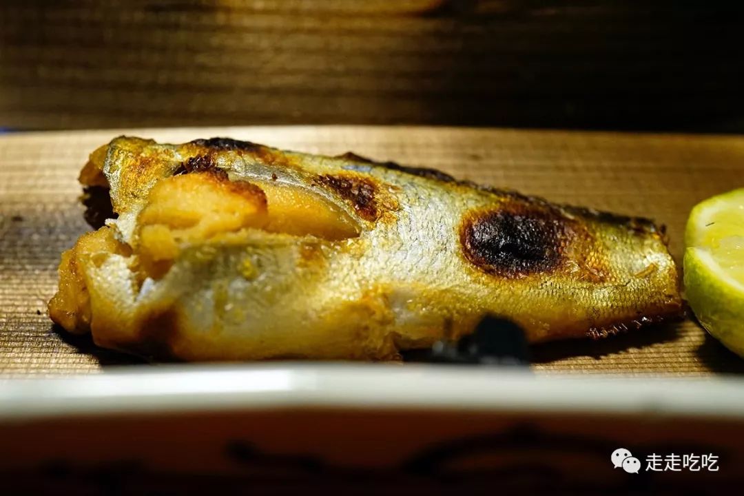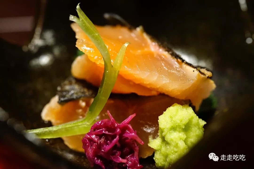 随后而来的是味道浓郁的白味噌汤,内有柿味,中间一块米糕(もち)点缀少许黄芥末,暖胃开怀,驱走山中秋夜寒气。而向付则是烟熏河鳟,乃山野河流中所产,简单却不失滋味。