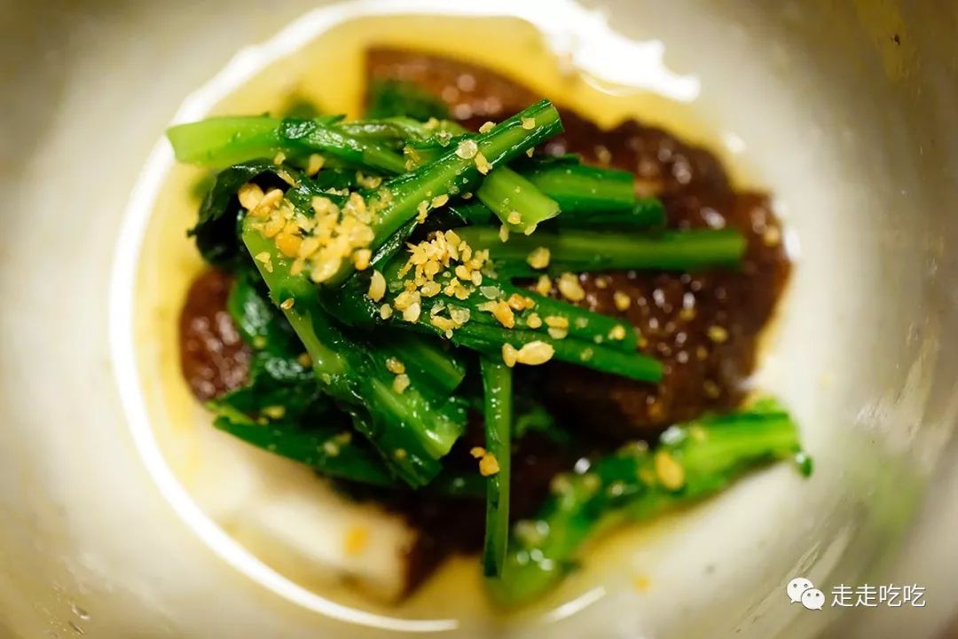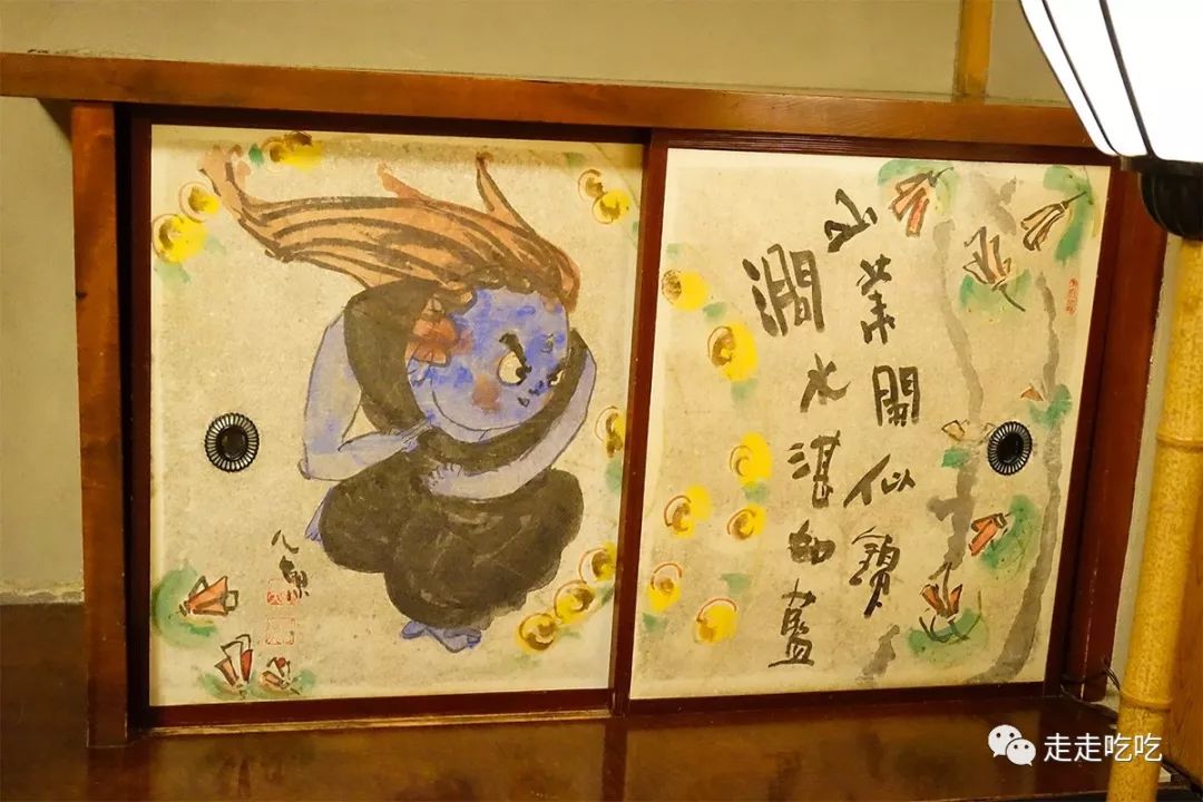但我们还是选择于个室用餐,门外是夜色中的山石草木,一幅山村晚景图跃然纸上,正应和了室内柜门上释道宁的“山花开似锦,涧水湛如蓝”两句偈语。