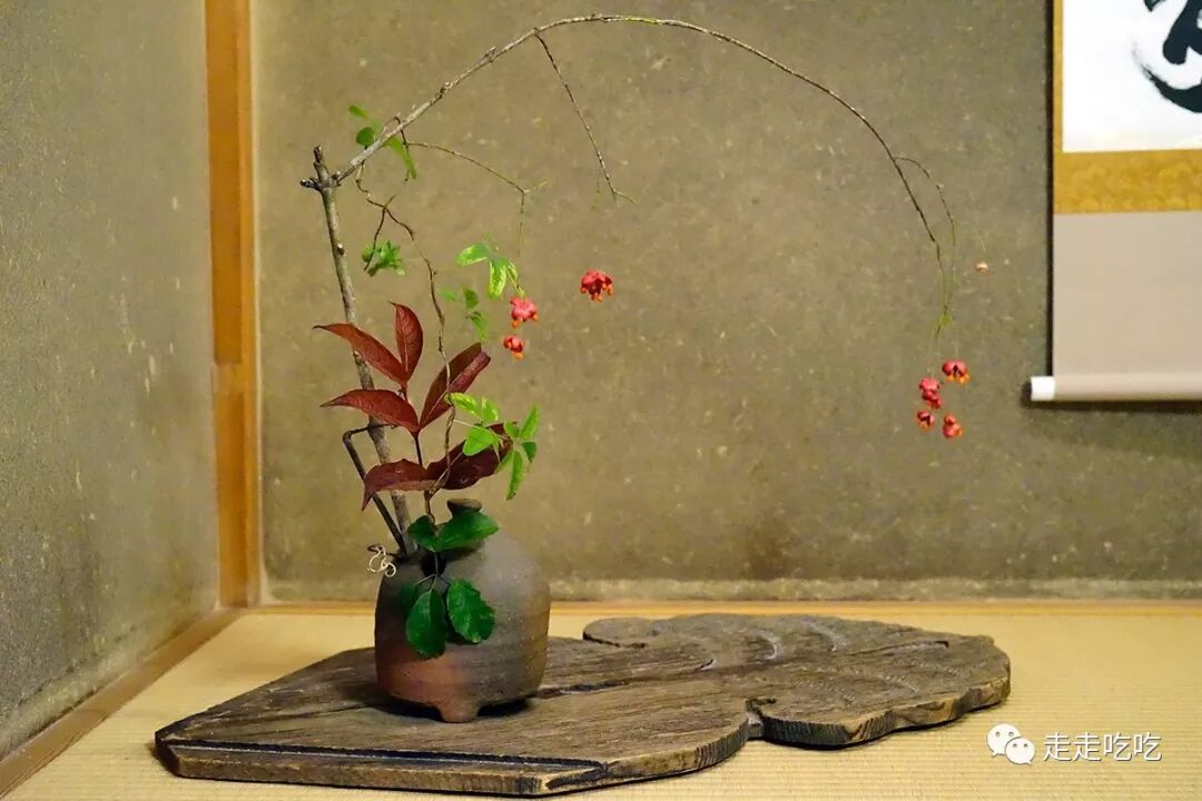 我们预订的是河翼(川の棟)的石楠花房间,位于走廊尽头,路上仲居介绍了温泉及其他设施的开放时间和使用方法。石楠花面朝小溪,门外树木茂密,叶色正渐次转变,极富层次感;溪流不绝,秋风微拂,水流声与树叶摩挲声参差鸣响,令人心旷神怡。床之间的挂轴和插花用的垂丝卫矛(吊り花),都是一派秋景象。