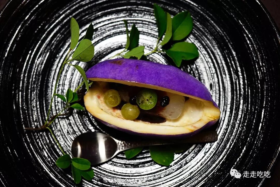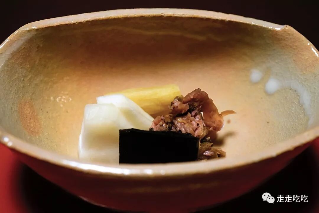甜品是一整个木通,配以野外采摘的野葡萄和野猕猴桃,点缀少许黑糖和糖渍果干。这个甜品也许经过四代目改良,因看旧菜谱发现当年作为秋季水果子(水菓子)的木通并未做过多搭配和处理。木通香气怡人,清雅中透着淡淡甜味;野猕猴桃则酸味突出,为简单的水果甜品加多了一层味道。