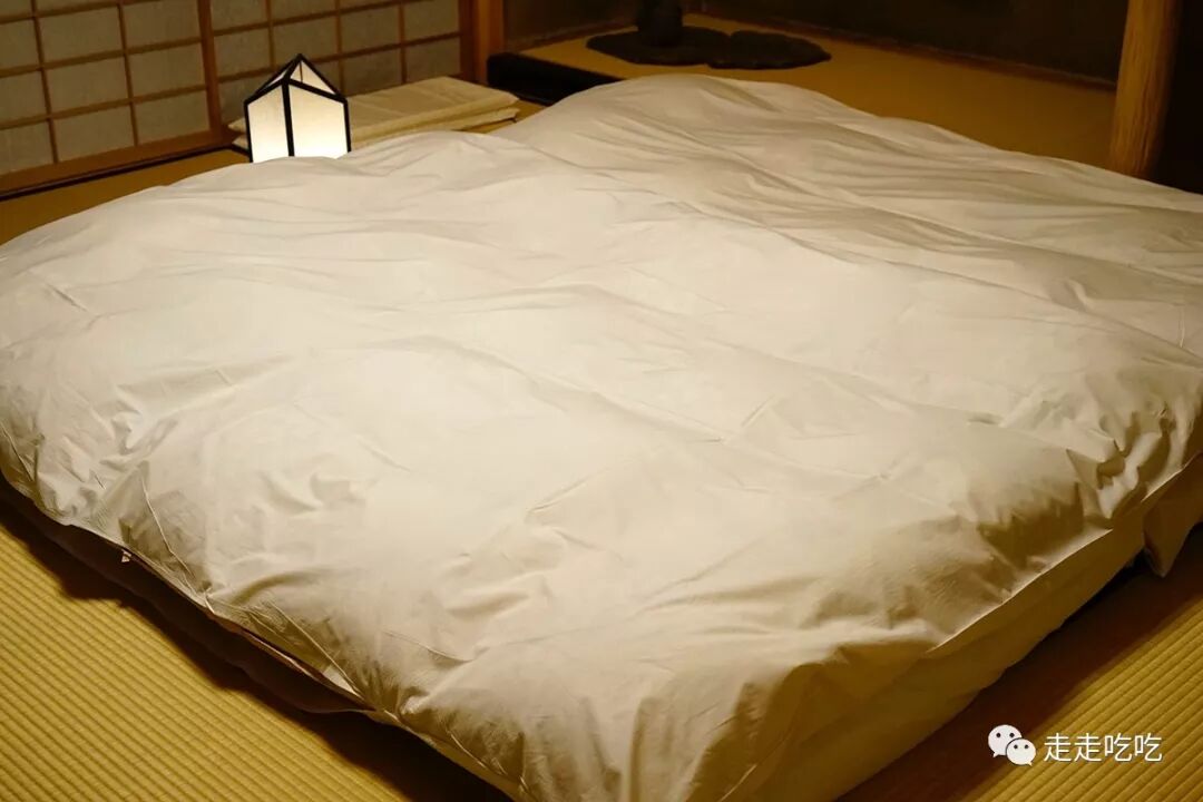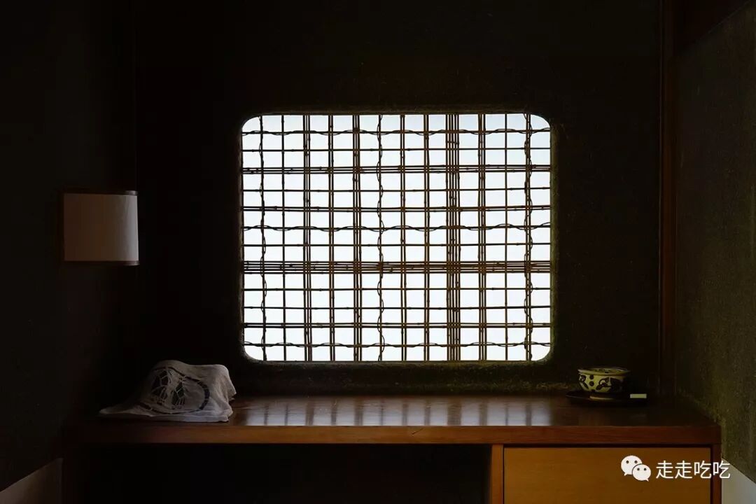 午后的阳光将叶影投射到墙面上,稀稀落落;幽暗处的下地窗(下地窓)如同一幅光影图画,简洁细腻。渐渐西行的太阳失去了力量,令一切都降下温来,更添一丝静谧感。我们决定先换上浴衣去周围走走。