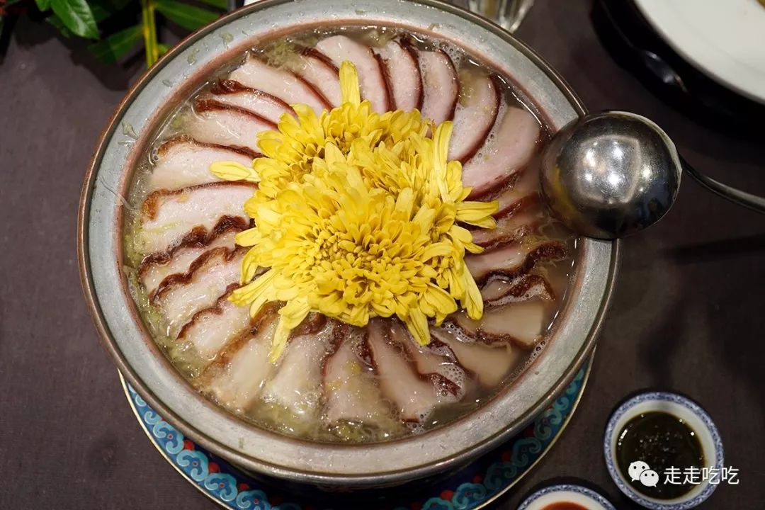 甄建军师傅的手艺了得,为人谦和,上菜时常给食客介绍菜式的一些小掌故,令人满足口腹之欲的同时,又增长了知识。此处的酱爆肉丁制作精细,火候到位,一上桌必须即刻分食,才能品尝到外皮酥脆、内里柔润的妙法。第一次去的时候,因未尽兴,这道菜我们点了两次。菊花酸菜热锅汤汁酸爽开胃,菊花清雅,肉质酥润,不过这与唐鲁孙说的同和堂菊花锅子是无关的两个菜。招牌菜之一的灌汤黄鱼需要费时找合适的黄鱼,做工又十分复杂,黄鱼灌好后要形态完整不破损,在宾客面前现场开鱼。上桌时有福禄寿喜看牌压鱼身上,说完吉祥话后才破开天窗让客人一窥乾坤。鱼肉和肚子里的各色食材交织缠绵,配以高汤和鱼身周围的燕菜一同食用,十分鲜美。