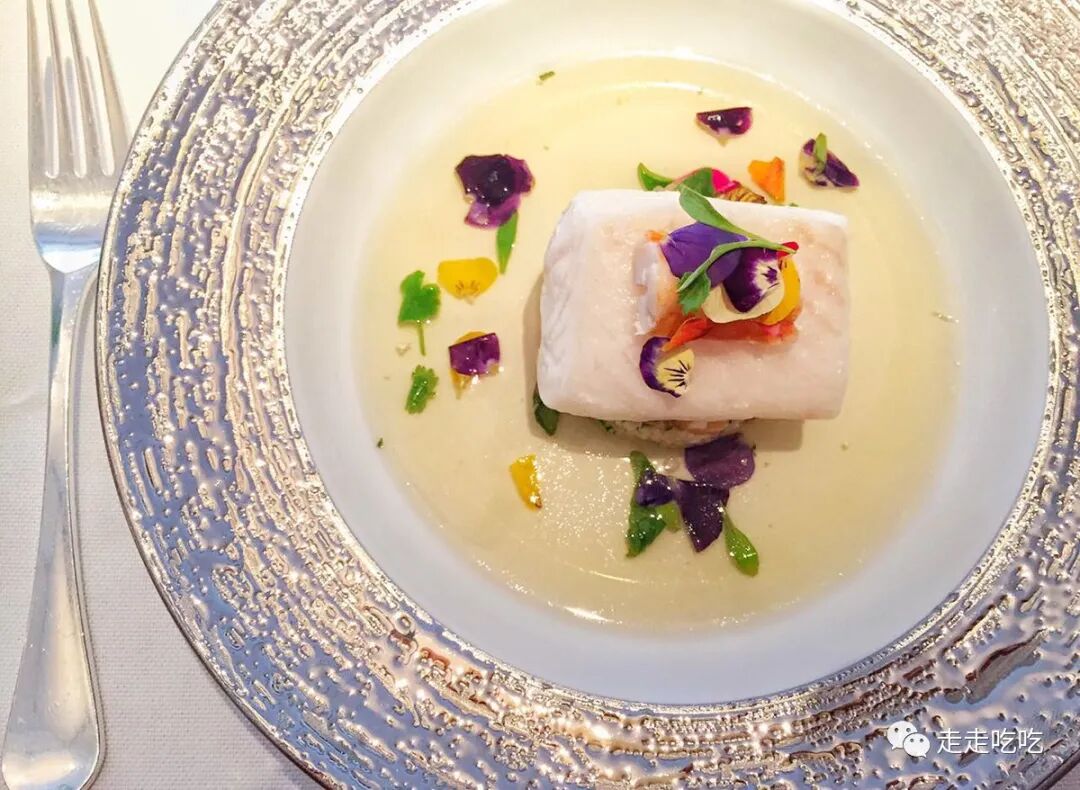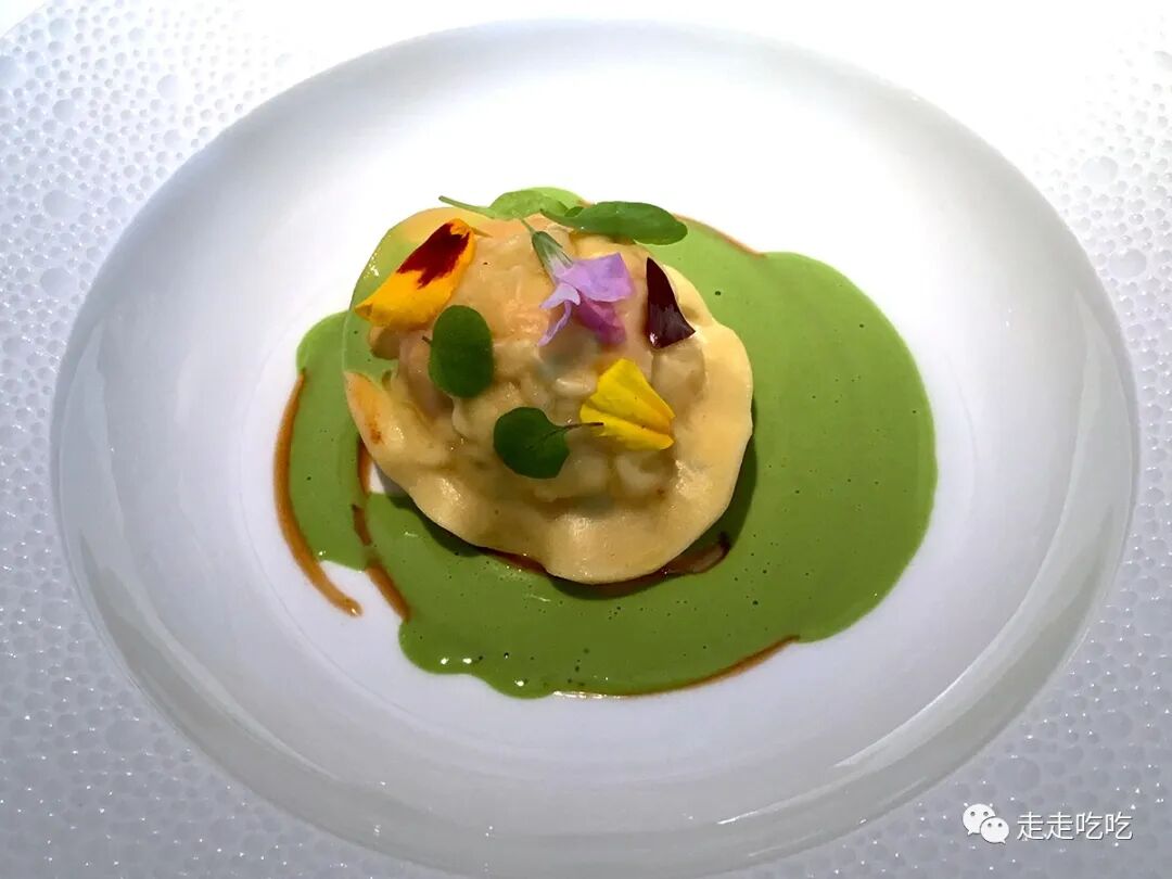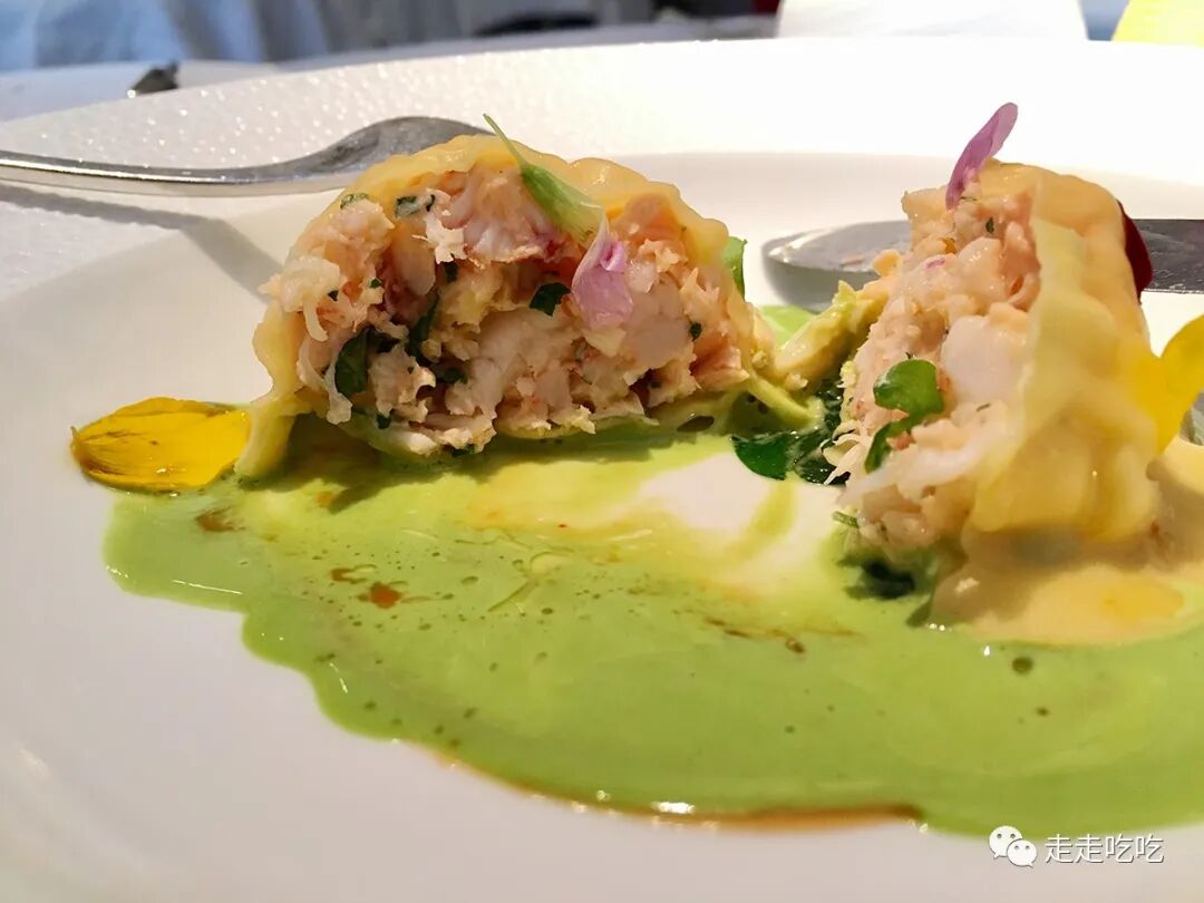 随后而来的是Gordon著名的龙虾饺子(ravioli),这道菜的原型是当年Marco Pierre White(1961- )的Harveys餐厅(1987-1993)的名菜。馅料除了龙虾外,还有螯虾和三文鱼,三种食材取不同的味道和口感。这饺子个头颇大,一只一盘,配以龙虾汤和酢浆草汁,最后点缀有酢浆草花,初闻有清新香气,入口则味道十分浓郁,尾韵却收咸了,失了些平衡。