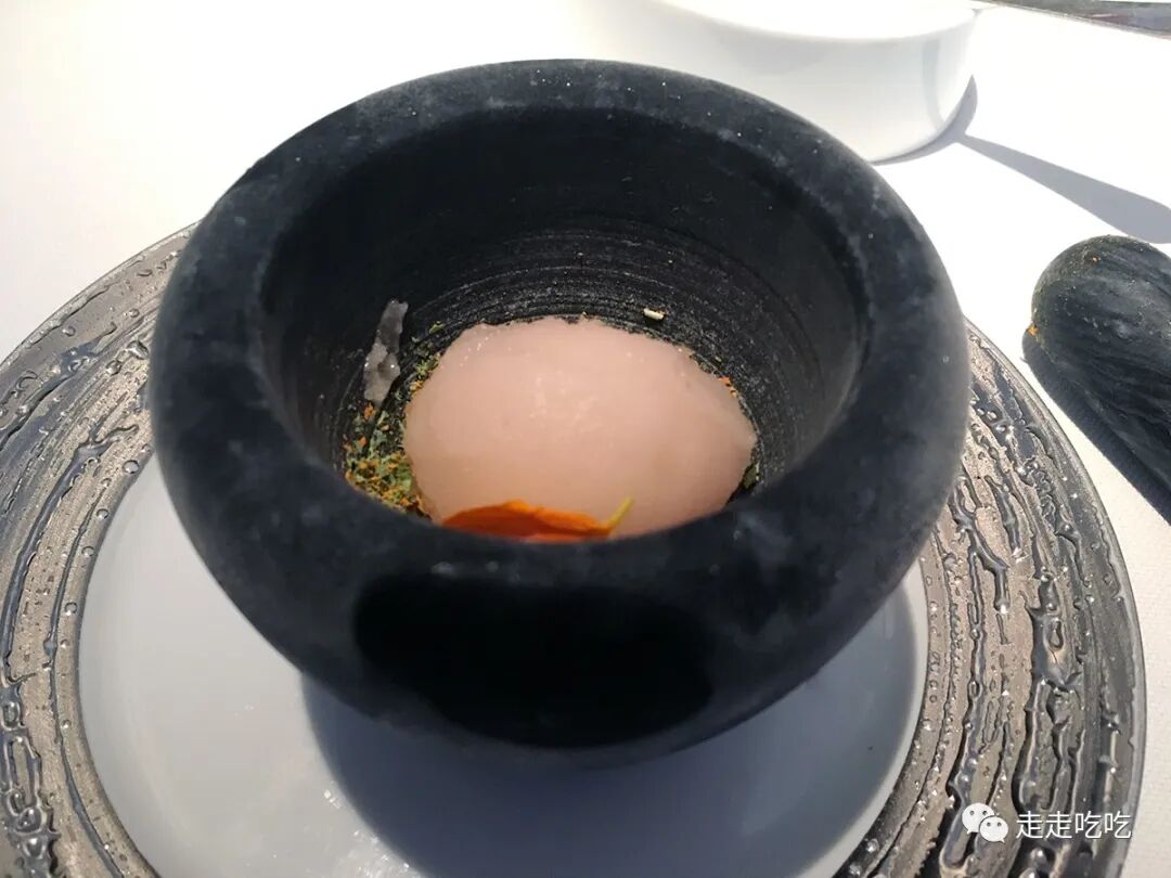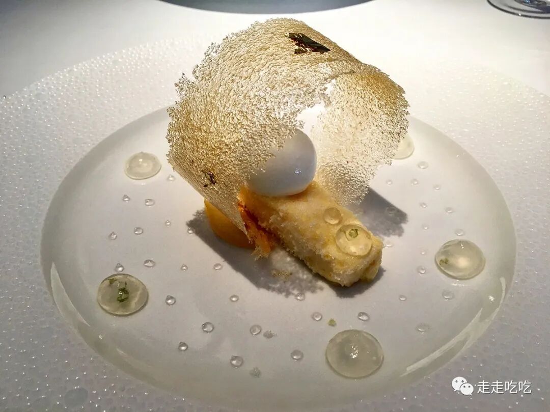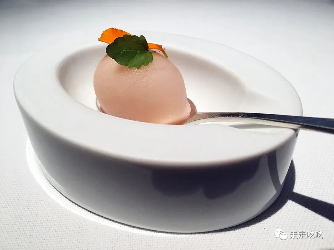 与W小姐闲聊间,已进入甜品环节。甜品前一道冷汤清清味蕾,用的是树莓和柠檬马鞭草。随后是柠檬雪葩,用液氮急冻香料叶子,捣碎后加入雪葩中,但柠檬叶的味道太过抢戏,失了平衡。不过后来在上海的泰安门又看到了这道甜品,烹饪真是最没法谈版权的领域了。