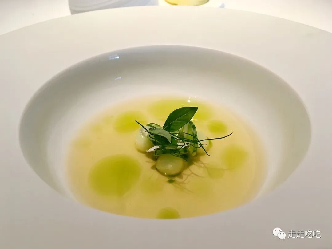与W小姐闲聊没多久,开胃菜便上桌了。一道番茄冷汤,罗勒与番茄的搭配亦十分中规中矩,配上新鲜切片的黄瓜和腌黄瓜,清香微酸,确实有开胃的效果。