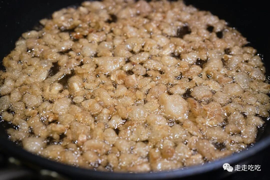 母亲熬猪油向来都是用油熬油,也就是先在锅中放些油,然后把切好的猪板油下锅油炸至充分出油。这个方法是居家熬猪油最省时省力的。不过我喜欢用干式熬制法,意即直接把板油下锅熬制,不加额外的油。不过若想要洁白如雪的猪油,需要用湿式熬制,前面两个方法熬出来的猪油都偏黄。湿式熬制法就是用少量水去煮板油,至猪油出尽,水分蒸发。我个人喜欢干式的原因在于这样熬制出来的猪油香气最重,美拉德反应(Maillard reaction)的作用不可小瞧。