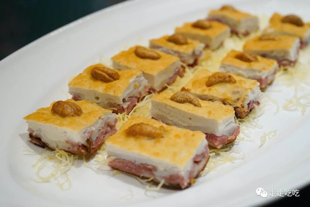 邓师傅做的腰果鸭方第一层用鸡糁蒸制定型,之后经过油煎成菜。鸡糕入口细腻蓬松,口感轻柔,鲜味突出,食客一吃只品出鲜味却难以捉摸制法,是非常有意思的体验。