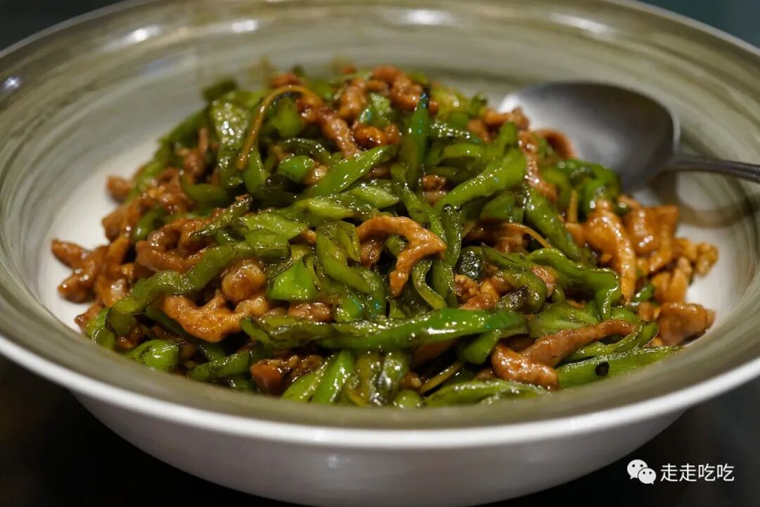 再说一道随饭菜青椒肉丝,这是典型俏荤菜,即素配料多过肉类主料的荤菜。青椒不是甜椒,是青二荆条辣椒。肉丝码味后加葱姜水、水豆粉、蛋清和清油抓上劲。热锅加入菜籽油和猪油,四五成热下肉丝炒散,入姜蒜丝和甜面酱炒匀,加青椒丝炒至断生,烹入碗芡略炒即成。整个过程短暂,听上去也简单,但如何炒得肉丝嫩而不脱桨,青椒熟度刚好,并非一朝一夕可练就。