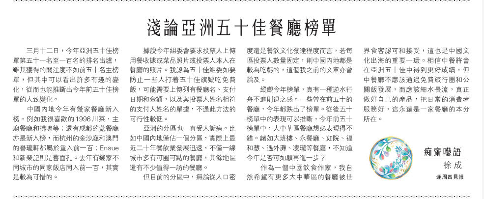 浅论2026年亚洲50佳榜单51-100名|饮馔短歌