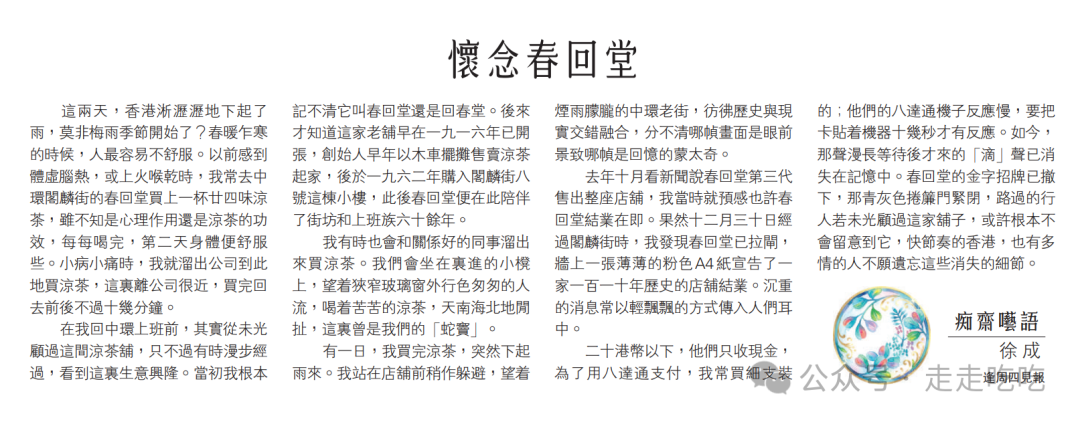 二十港币以下,他们只收现金,为了用八达通支付,我常买细支装的;他们的八达通机子反应慢,要把卡贴着机器十几秒才有反应。如今,那声漫长等待后才来的“滴”声已消失在记忆中。