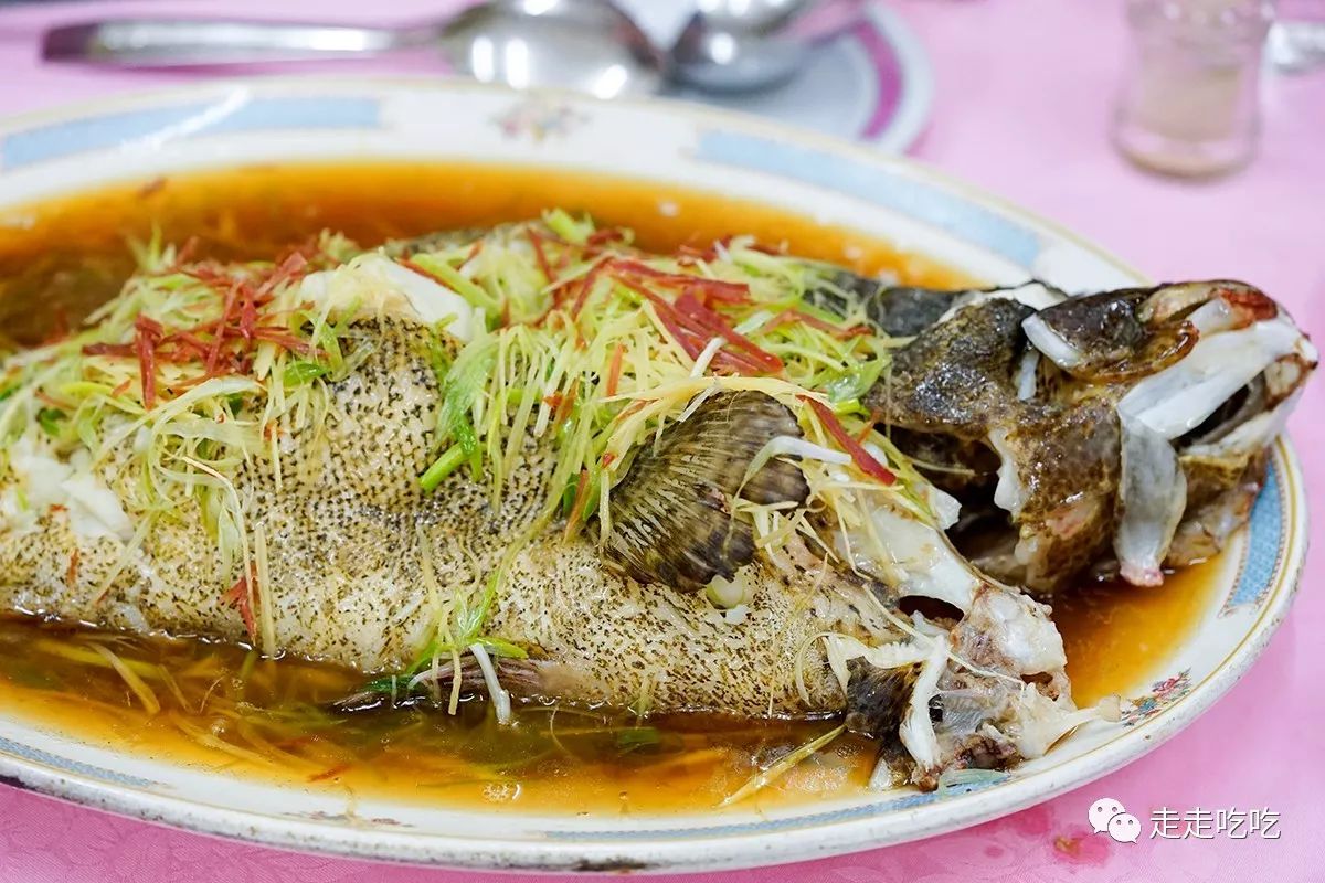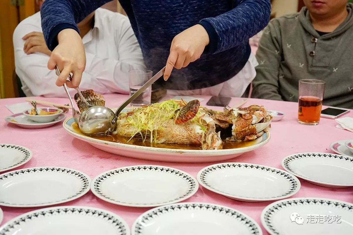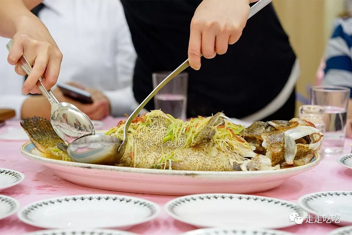 蛇羹之后上桌的便是粤菜中的经典菜式蒸鱼了。崩牙成用的是5斤左右的黄皮老虎,一上桌气势万千。黄皮老虎即为褐点石斑鱼,俗称老虎斑,一般野生种皮色呈褐黄色,故名黄皮老虎。