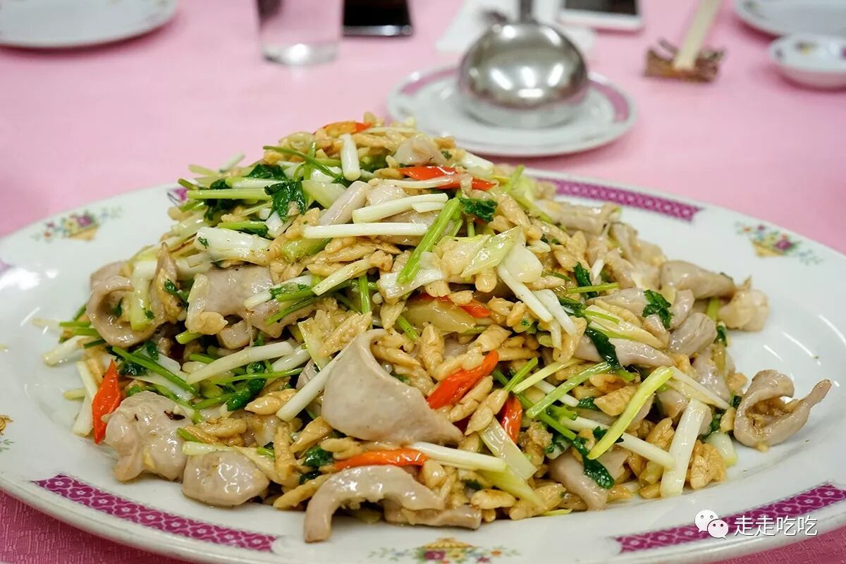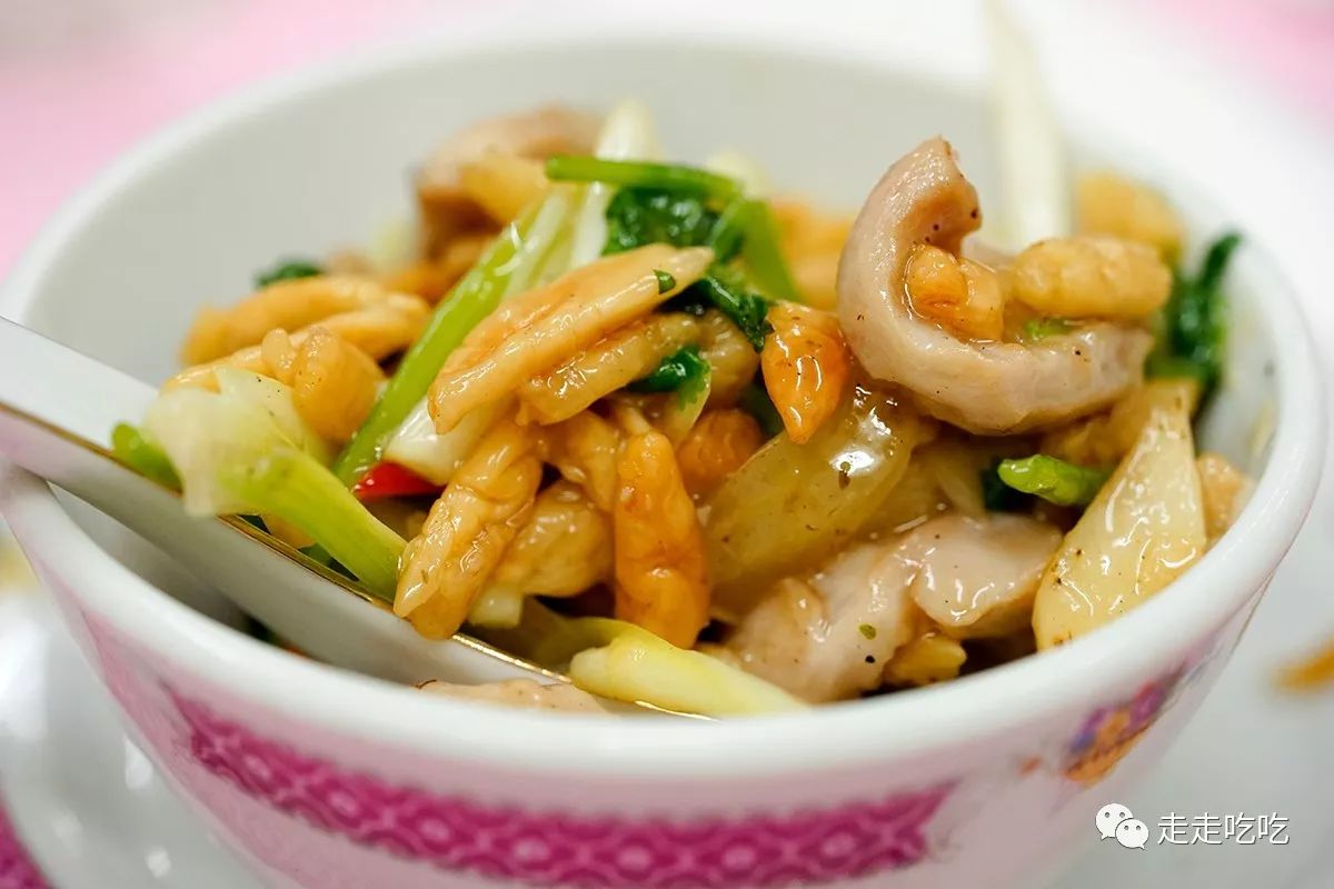 第二个上桌的是榄仁肚尖,亦是经典菜之一。榄仁乃乌橄榄晒干后的果核。榄仁香气突出,油脂丰富,入菜可提香并增加口感。除了炒肚尖外,粤港一带炒水鱼(甲鱼)丝也习惯搭配榄仁。